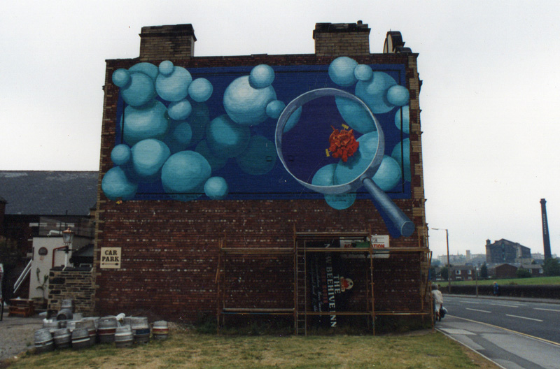 Painted on the Beehive pub in Bradford. The bubbles represent vast empty space, while the magnifying glass is zooming in on the tight packed planet Bradford/Galway.