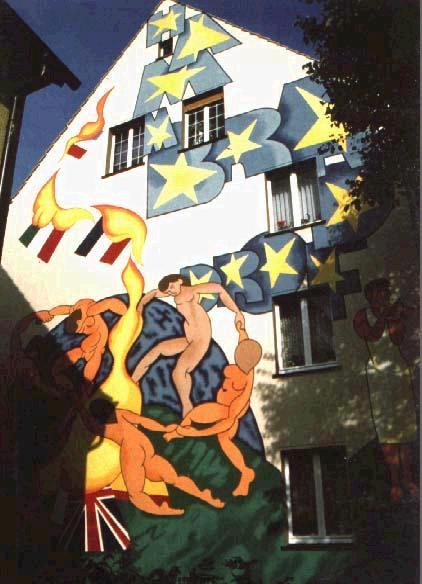 This 60ft high mural is of the joyful Europeans dancing round the fire of national flags, from which come the 12 stars if Europe (1993).