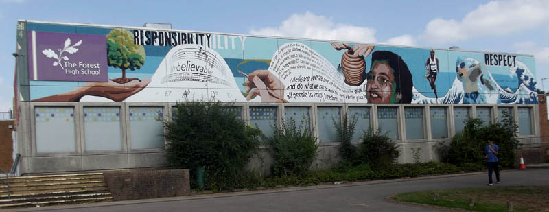 I was asked to make the work Forest High specific, so I included things like the road map of Cinderford, text by Harry Beddington, the score for 'Unbelieveabe' by EMF, the miner, a discrete reference to John McAfee, and the map of Romania to reflect the large Romanian origin population in the school.