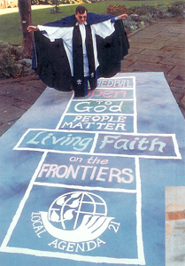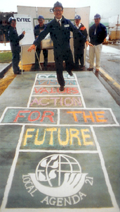 The Lord Mayor, University Vice-Chancellor, Cathedral Provost, business people, community groups and individuals all took part. They chose their key words representing "sustainable development", which were then chalked into the hopscotch squares, and they were then photographed hopping to it. Some of the people chose generalised sets of words, such as Professor John's "University of Bradford, Making, Knowledge, Work, For, The Future". Others such as Sarah the organic carrot chose very specific words, "Allotment, or Garden, Plant, Grow, Pick, Eat". This range of interpretation of Agenda 21 was important to make it clear that sustainability is about how we approach everything, not just cycling, recycling, or litter.