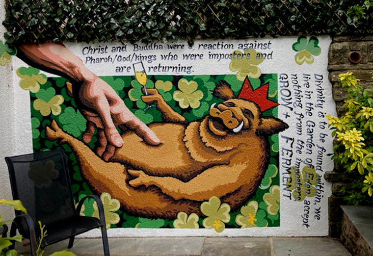 Tony and Lucy asked me to paint a mural of my own desires in their garden. I floated a few ideas, and then realised what I wanted to paint was my pandemic response. They then made a few suggestions which were improvements and being happy to take all the help I can get in they went. 2022.