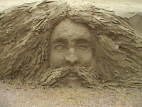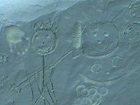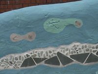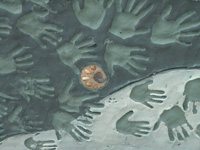 Featuring cement relief heads, inlaid tiles, stones and objects, indents made by objects and hands, and kids drawings scratched into the wet cement.