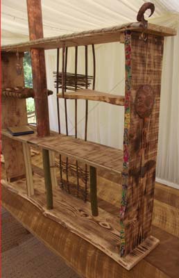 I made this bookshelf at a wedding with the guests, for the presents that were all books. I was asked not for my fine joinery skills but because I might manage to include and encourage everyone's efforts and ideas in a co-ordinated fashion. With bits of bark and willow weaving, metal beating, painting, crude joinery and more.