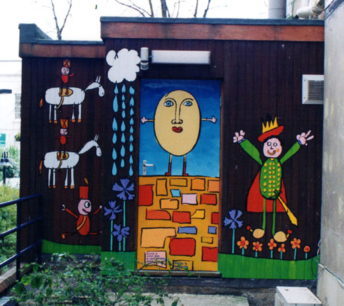 The eye department wanted a mural painted across a courtyard from the consultation room with clear imagery for rapid eye tests.