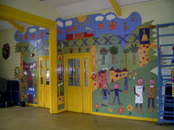 Lydbrook Primary School, 2009. Centenary celebration mural in dining hall.