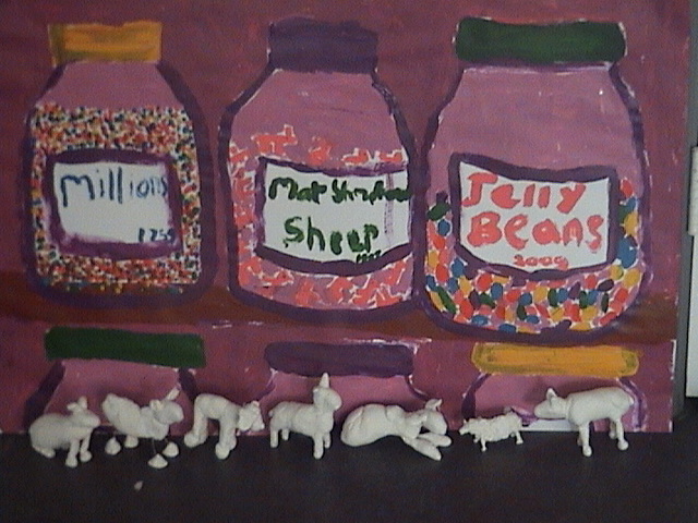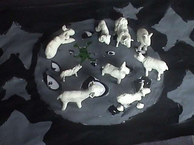 Plasterscine models in front of painted backdrops by Cinderford Artspace kids artsclub, age 8-12, for part of a 2 day Sheepscape workshop.